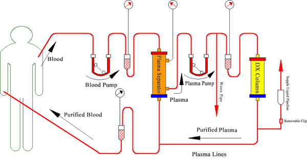 DX系列一次性使用膽紅素吸附柱(以下簡稱DX吸附柱)利用血漿分離器和血液凈化支持系統(tǒng),將高膽紅素血癥、高膽汁酸血癥患者的血液引出體外,經(jīng)血漿分離器分離出血漿,進行血漿吸附,清除患者體內(nèi)的膽紅素和膽汁酸,達到凈化血液的治療目的。